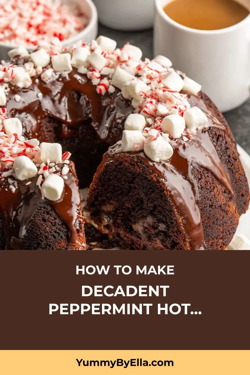 Indulge in the winter magic with a decadent Peppermint Hot Chocolate Cake, a rich chocolate bundt cake infused with peppermint, topped with ganache, candy canes, and marshmallows.