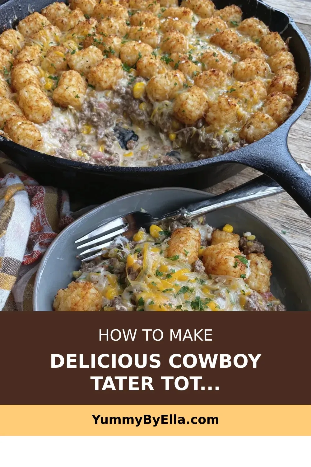 “Cowboy Tater Tot Casserole: A hearty, creamy, and cheesy meal that’s a nostalgic blend of crispy tater tots and savory beef mixture.”