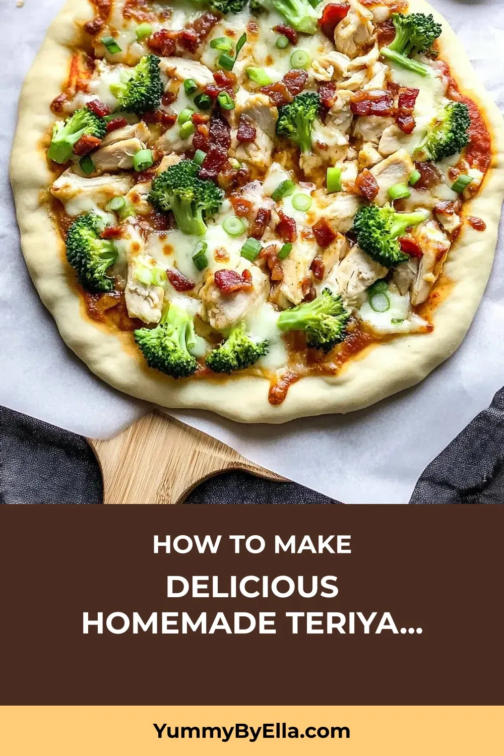 Brush the dough with teriyaki sauce. Layer on the chicken, bacon, broccoli, and tomatoes, making sure to leave a 1-inch border. Sprinkle the mozzarella on top.