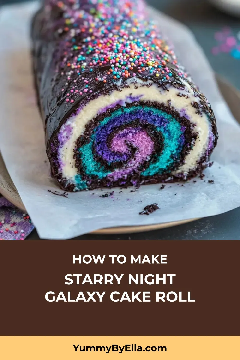 “Create a cosmic explosion of flavor with this stunning Galaxy Cake Roll, a vibrant masterpiece with creamy filling and glossy black chocolate ganache.”